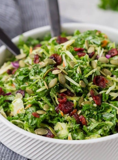 Ingredients: kale, carrots, red cabbage, parmesan, pumpkin seeds, quinoa, dried cranberries, poppyseeds, honey, white wine vinegar, greek yogurt, olive oil, black poppyseeds, salt, pepper